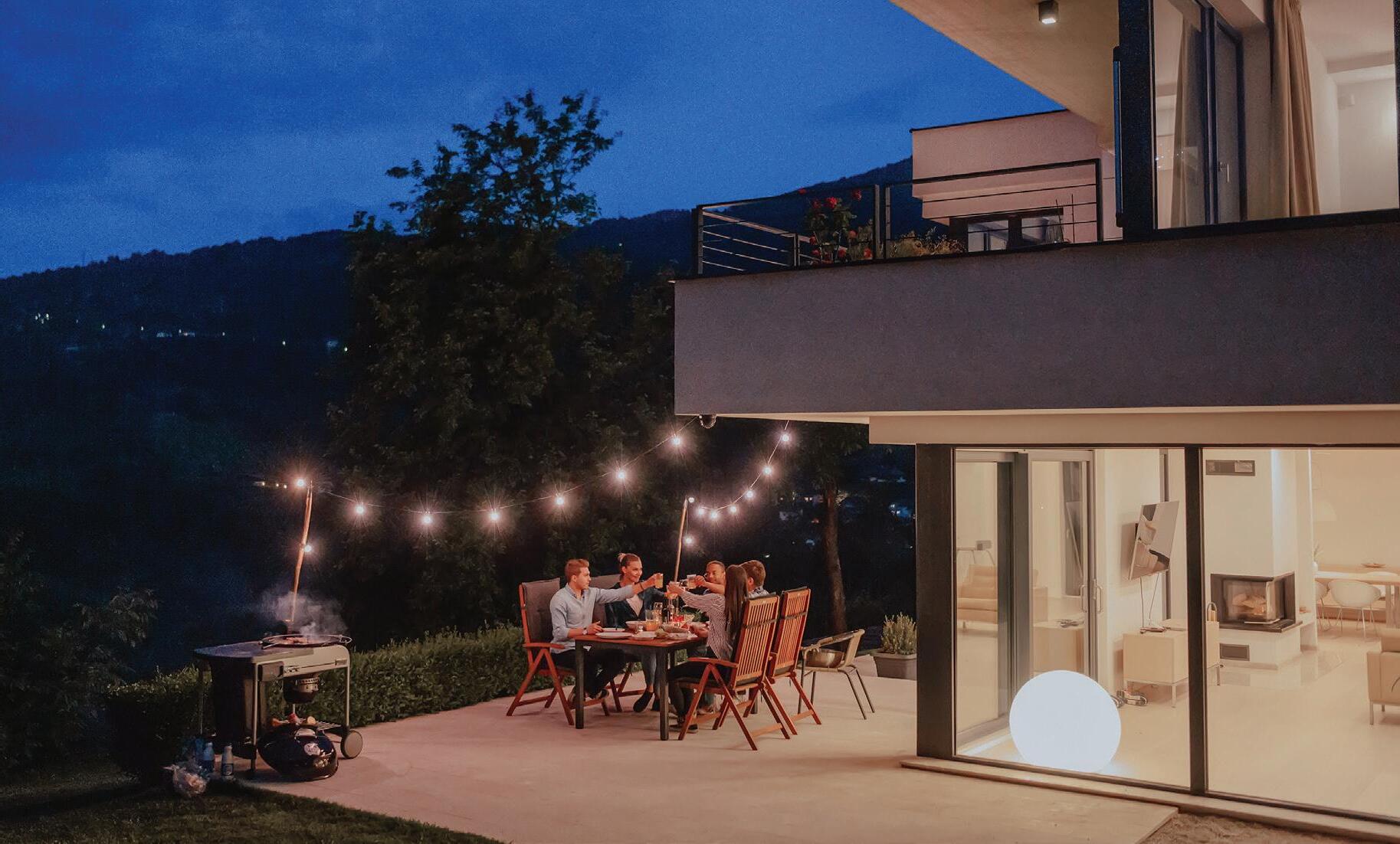 The outdoor living space, cleverly positioned between the pavilion’s wings, offers yearround enjoyment with its retractable roof and open fireplace.