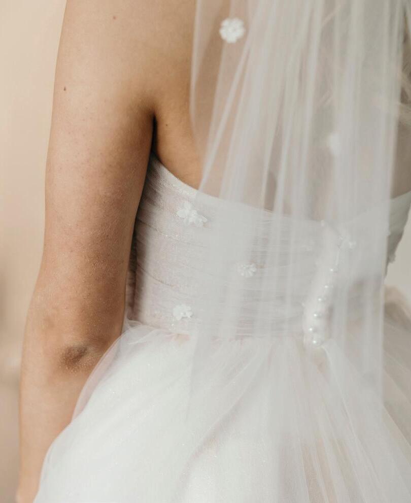 This soft, romantic gown features eight layers of tulle and is lined with the option to add a glitter layer for delicate detailing. A strapless ruched bodice is highlighted with daisy-style flowers that are hand-beaded with a pearl.