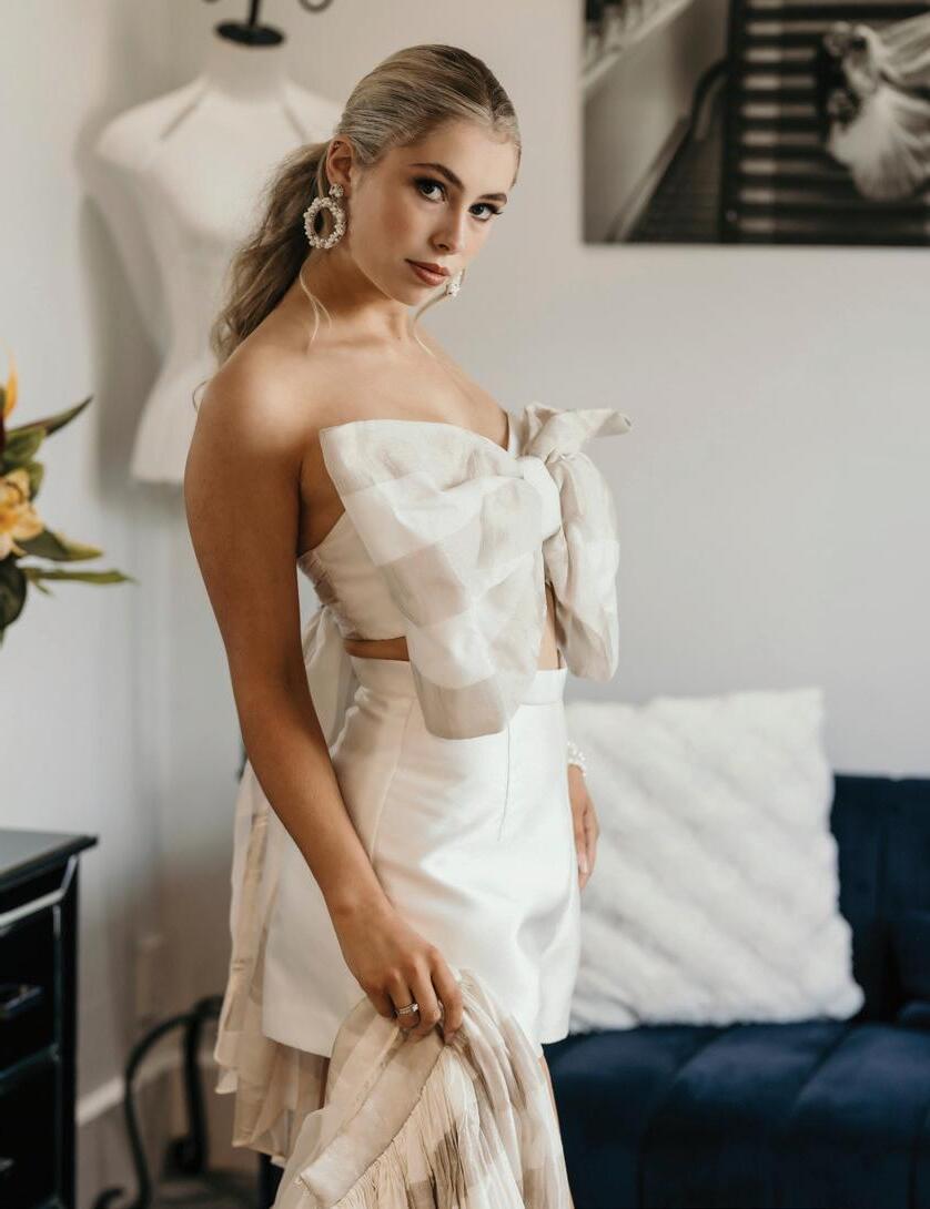 A 3-piece gown made from mikado and metallic silk organza. Tailored shorts and a bandeau top with a large feature bow for a modern bride at a destination wedding. The matching silk organza overskirt features a wraparound front split feature that is easily removed for a fun party look at your reception.