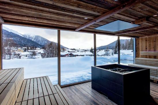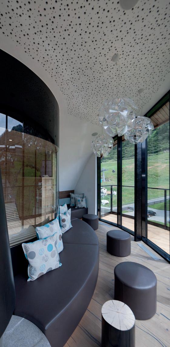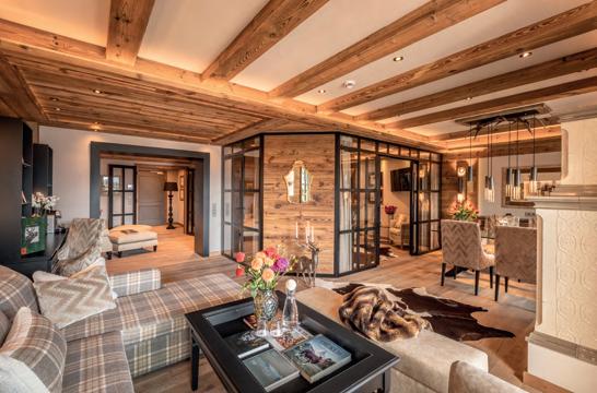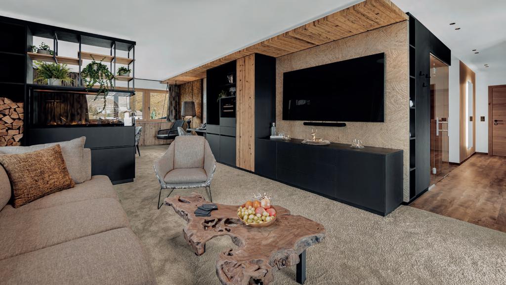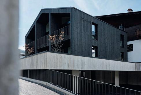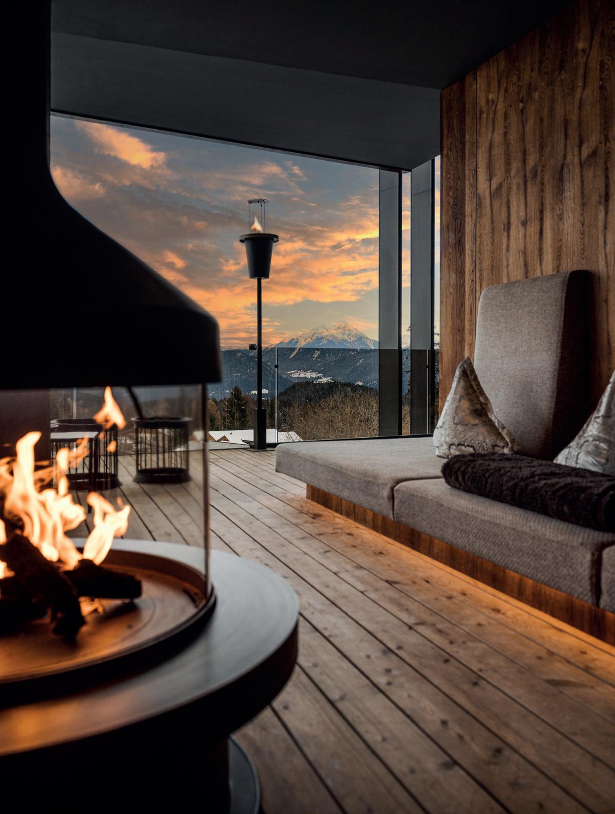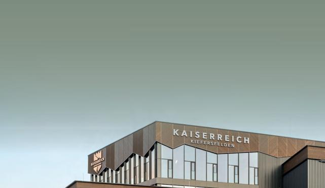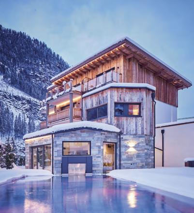 Architektur trifft Alpenpanorama. Das nordsüdlich-ausgerichtete Gebäude fügt sich harmonisch in die Landschaft ein. Rundum gibt es Außenbereiche, die einen 360°-Blick auf das Kitzbüheler Horn und den Wilden Kaiser eröffnen. Holz spielt eine wichtige Rolle und zieht sich als roter Faden durch das Design –außen rustikal und naturbelassen, innen in warmen, veredelten Tönen.
