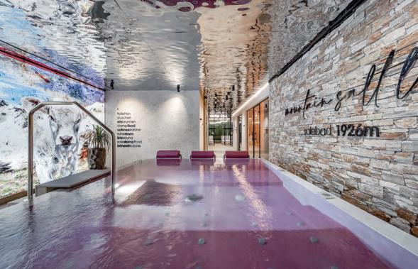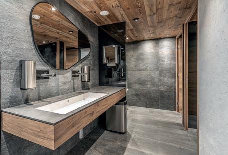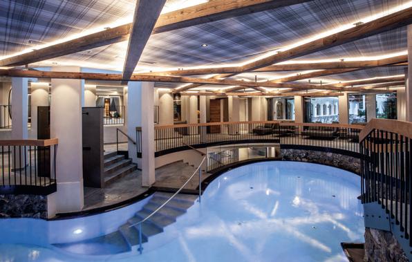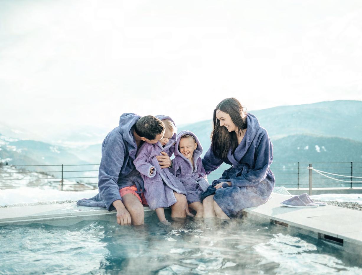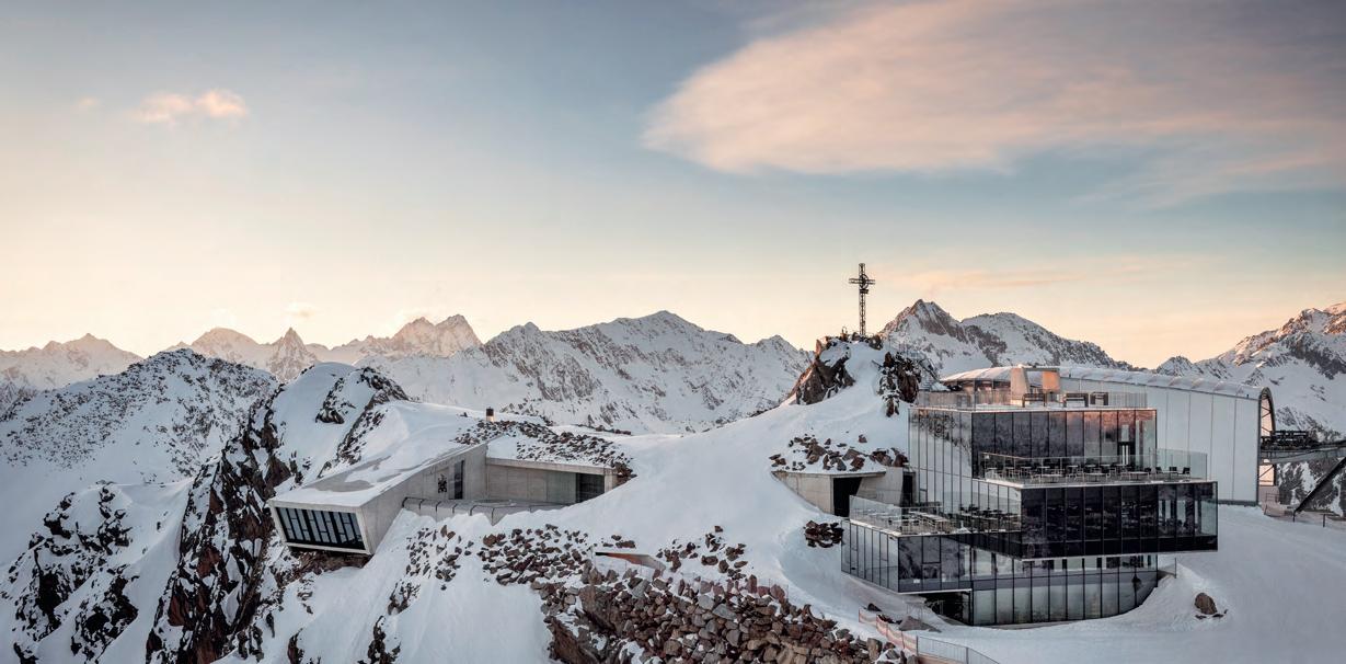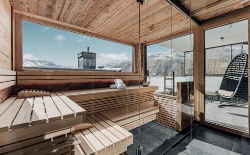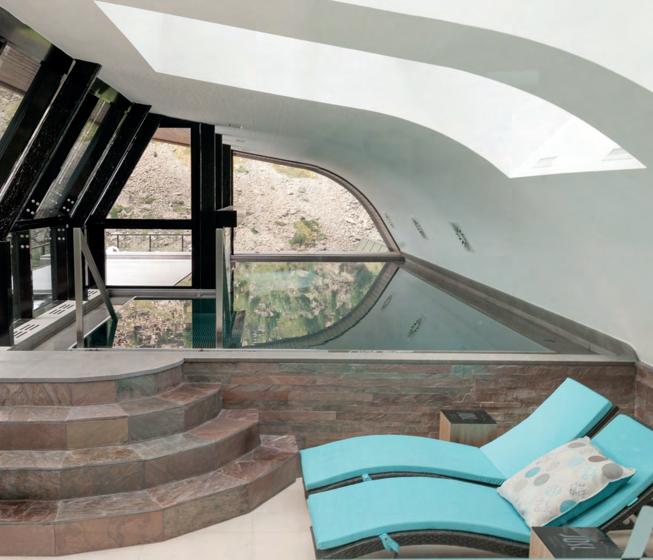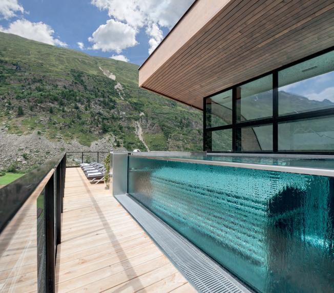 Architektur trifft Alpenpanorama. Das nordsüdlich-ausgerichtete Gebäude fügt sich harmonisch in die Landschaft ein. Rundum gibt es Außenbereiche, die einen 360°-Blick auf das Kitzbüheler Horn und den Wilden Kaiser eröffnen. Holz spielt eine wichtige Rolle und zieht sich als roter Faden durch das Design –außen rustikal und naturbelassen, innen in warmen, veredelten Tönen.