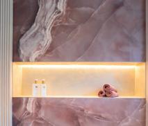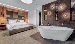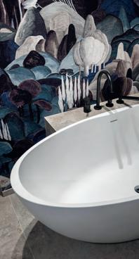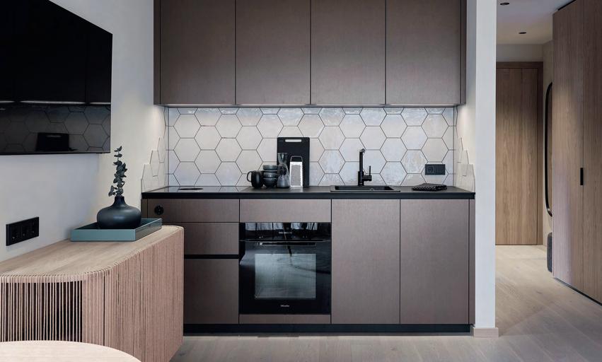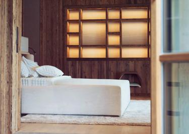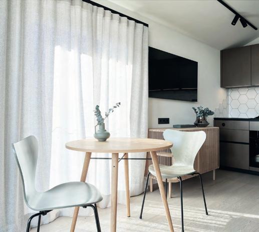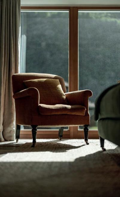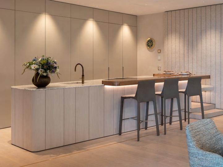Leichtigkeit und Luxus. Die Innenarchitektur zelebriert eine geerdete Leichtigkeit, in der sich moderne Materialien und sanfte Farbkonzepte mit der Holzoptik vereinen. Textile Elemente mit dezenten Mustern bringen eine subtile Lebendigkeit. Die Materialwahl, die Farbgebung und die Kombination aus schlichtem und luxuriösem Design schaffen eine zeitgemäße Atmosphäre: einladend und elegant, mit einer echten Verbundenheit zur umgebenden Natur.