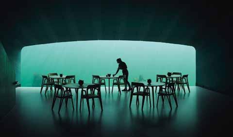 n der zerklüfteten Südspitze Norwegens befindet sich Europas erstes Unterwasserrestaurant. Fünf Meter unter der Wasseroberfläche genießt man im » Under « eine spektakuläre Aussicht auf den Meeresboden und kulinarische Abenteuer auf dem Porzellen. Das Gebäude des norwegischen Architekturbüros Snøhetta, das schon viele aufsehenerregende Projekte auf der ganzen Welt umgesetzt hat, durchbricht mit seiner 34 Meter langen monolithischen Form die Wasseroberfläche. An der rauen Struktur des Betons siedeln sich Nacktschnecken und Seetang an, gleichzeitig halten die dicken Wände dem Druck und den Erschütterungen der rauen Bedingungen stand. Im Essbereich dominiert das riesige Panoramafenster, das als dramatische Kulisse den Blick auf das vorgelagerte und abends beleuchtete Riff öffnet. «
