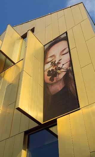 GOLDENE HÜLLE Das städtische Museum » W « im niederländischen Weert wurde neulich von Designer Maurice Mentjens umgebaut und um einen Anbau im goldglänzenden Metallkleid ergänzt. Damit hat er die erhaltenswerten historischen Elemente des unter staatlichem Denkmalschutz stehenden Gebäudes im Zentrum der Stadt wieder sichtbar gemacht. Gegenwart und Vergangenheit verschmelzen in einem denkmalgeschützten Bauwerk mit goldener Ummantelung.