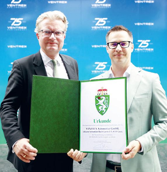 1 VENTREX wird 75 „Wir sind sehr stolz auf 75 Jahre Technologieführerschaft“, freut sich VENTREX-CEO Wolfgang Klautzer über das Jubiläum. Die Technologien von VENTREX ermöglichen eine umweltfreundliche, moderne Mobilität. Bereits seit 1949 setzt das Grazer Unternehmen auf die Mobilität der Menschen: zu Beginn noch als Hersteller von Luftreifen-Ventilen und Pannenset-Kompressoren, entwickelte sich das steirische Unternehmen seit den Fünfziger- und Sechziger-Jahren über die Jahrzehnte hin zum Marktführer für Ventiltechnik in alternativen Antrieben der Automobilbranche. Am Foto: Die Verleihung des steirischen Landeswappens durch Landeshauptmann Christopher Drexler.
