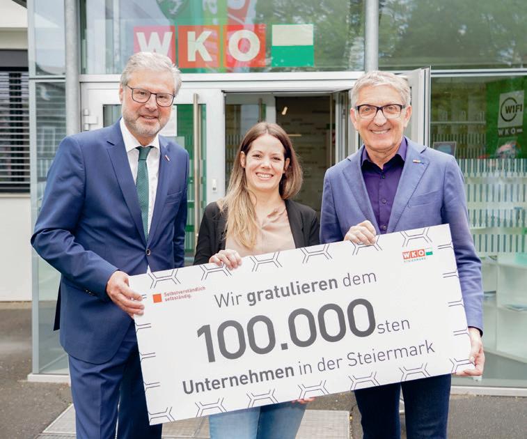 Mit der Gewerbeanmeldung von Katharina Dings-leder in der Regionalstelle Südsteiermark überstieg die Zahl der WKOMitglieder in der Steiermark erstmals die magische Schwelle von 100.000. „Ein historischer Höchststand, noch nie zuvor gab es so viele Unternehmerinnen und Unternehmer in unserem Land“, freuen sich WKO - Steiermark-Präsident Josef Herk und -Direktor Karl-Heinz Dernoscheg anlässlich dieses besonderen Anlasses. Foto: WKOSteiermark-Direktor Karl-Heinz Dernoscheg (l.) und Präsident Josef Herk (r.) gratulieren Katharina Dingsleder zu ihrem Schritt in die Selbst ständigkeit.