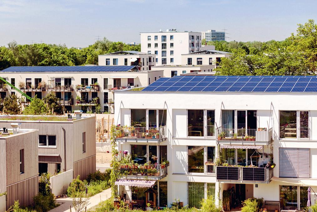 Nicht nur die Bewohner:innen, sondern auch alle Produkte des täglichen Lebens sollen möglichst kurze Strecken zurücklegen. Gemüse wird etwa direkt im Wohngebiet angebaut, Energie wird durch PV-Anlagen auf den Dächern erzeugt.