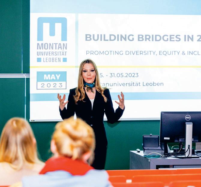 Die Montanuniversität Leoben nahm heuer zum zweiten Mal am „Diversity Month“ der Europäischen Union unter dem Motto „Building Bridges“ teil. Die Aktivitäten reichten von Workshops über Vorträge bis hin zu einer Movie Night. Die zahlreichen Teilnehmer:innen waren begeistert, und das Thema „Diversität“ soll das ganze Jahr über die Montanuniversität begleiten. Die Aktivitäten dieser Veranstaltung wurden für Mitarbeiter:innen, Wissenschaftler:innen und Studierende durchgeführt. Foto: Organisatorin Eva Wegerer beim Eröffnungsevent.