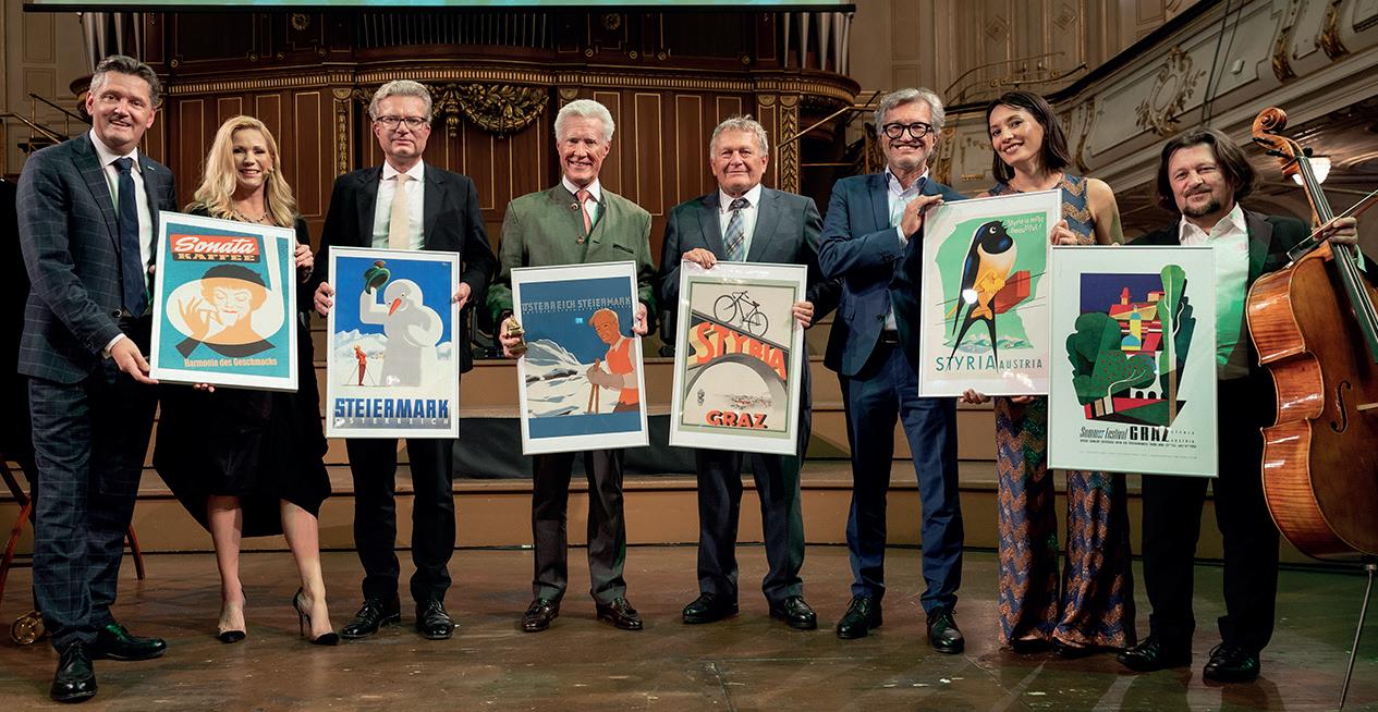 Alle Ehrengäste erhielten ausgewählte Plakate: Bernd Schönegger, Moderatorin Johanna Setzer, LH Christopher Drexler, Jean-François Decaux, Wolfgang Malik, Dieter Weber, Kim Barbier und Friedrich Kleinhapl