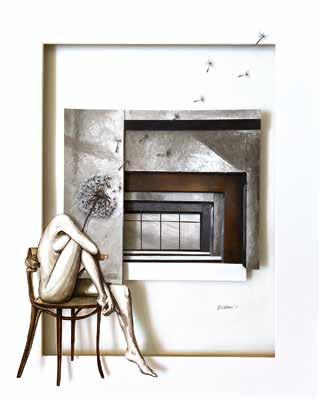 werde, war klar, aber Kunst als Brotjob war eigentlich nie ein Thema“, erzählt sie. Ein Jobangebot führt sie bald nach ihrem Abschluss nach Vorarlberg, wo sie 14 Jahre lang bleibt. Mittlerweile hat Eva ihren Lebensmittelpunkt über die Grenze verlegt, wo sie als Junior Art Director in einer der größten Werbeagenturen der Ostschweiz tätig ist und kürzlich eine weitere Ausbildung zur Interior Designerin absolviert hat. „Ich liebe meinen Beruf sehr, weil er so vielfältig ist und ich mit sehr unterschiedlichen Menschen und Themen in Berührung komme, aber die Kunst hat mich immer begleitet“, bringt sie es auf den Punkt. In ihren Arbeiten ist eine kontinuierliche Weiterentwicklung und dadurch spannende Bandbreite sichtbar. „Anfänglich habe ich bevorzugt in Acryl und Öl gemalt und natürlich immer viel gezeichnet. Vor einigen Jahren hat ein befreundeter Künstler gefragt, ob ich seine CD gestalten möchte und da bin ich auf die Idee gekommen, dafür eine Collagetechnik zu verwenden. Das hat mich bis heute nicht mehr losgelassen.“