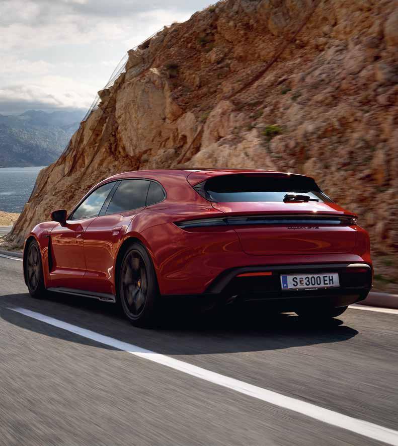 Taycan GTS Sport Turismo – Stromverbrauch kombiniert 21,0 – 24,1 kWh/100 km; CO₂-Emissionen kombiniert 0 g/km. Stand 12/2021. Die angegebenen Werte wurden nach dem vorgeschriebenen Messverfahren VO (EG) 715/2007 (in der gegenwärtig geltenden Fassung) im Rahmen der Typengenehmigung des Fahrzeugs auf Basis des neuen WLTP-Prüfverfahrens ermittelt.