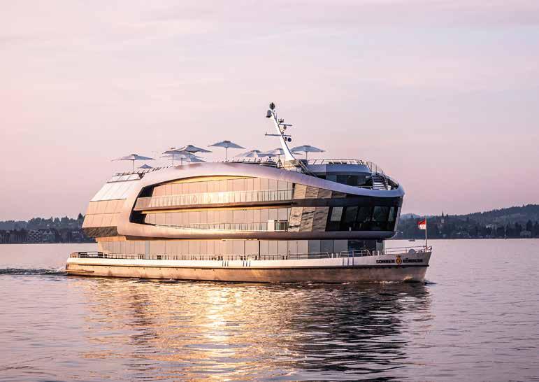 Richtung Sonnenuntergang gleitet , eröffnet das Streichquartett SaloniettaVorarlberg mit einem Walzer den Abend. Sopranistin Sabine Winter bringt den Saal zum Klingen und das Dani Felber Orchestra lässt Melodie, Rhythmus, Harmonie und Spielfreude verschmelzen. W ährend die Sonne im Wasser versinkt, macht sich der Nachthimmel bereit für das Feuerwerk, das mit fantastischen Lichtbildern und leuchtenden