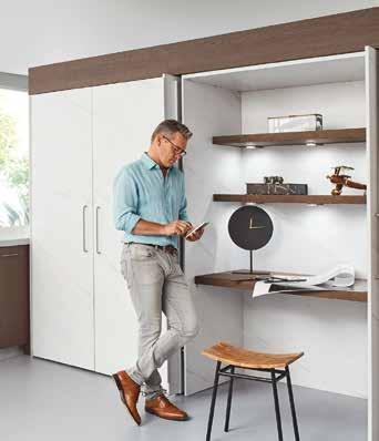 Funktionen auf intelligente Weise. Er erlaubt auf der einen Seite das komfortable Zubereiten von Mahlzeiten und auf der anderen Seite ein konzentriertes Arbeiten im Home-Office. Koffertüren können wie von Z auberhand seitlich versenkt werden, damit keine Schranktüren im Weg stehen. Mit intelligenten Lösungen können so verschiedene Möglichkeiten und optimale Flexibilität geschaffen werden. Mehr Bewegungsspielraum ist das Ergebnis. S o sieht Smart Living heute aus.