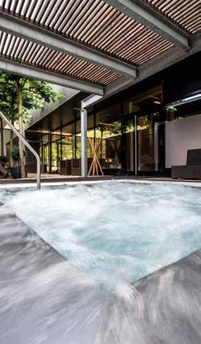 Infrarotkabine, Ruhebereich mit offenem Kamin und Massageraum. Im Außenbereich befinden sich ein Kneippbecken und eine überdachte Lounge, welche zum Verweilen zwischen den Saunagängen einlädt. Der Seminarraum ist mit einem 86“ Clevertouch Display ausgestattet. Die natürliche Bauweise und die großen Glasfronten sorgen für den nötigen Wohlfühl-Faktor und zahlreiche Sitznischen bieten den Seminarteilnehmern genügend Raum für Ideenaustausch.