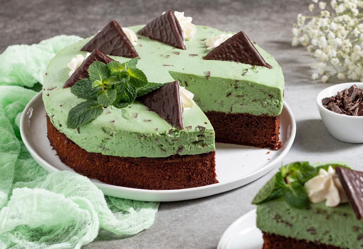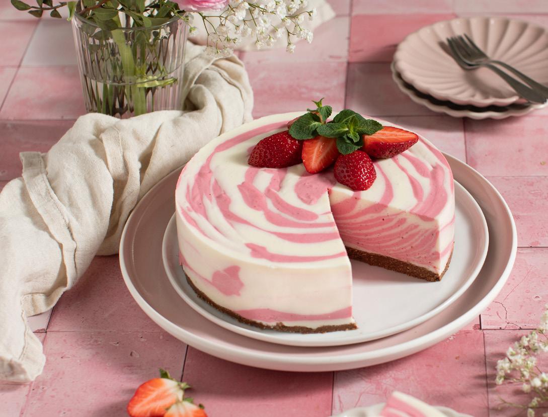 14. Springformrand entfernen. Mit frischen Erdbeeren, halbiert oder geviertelt, und frischer Minze verzieren.