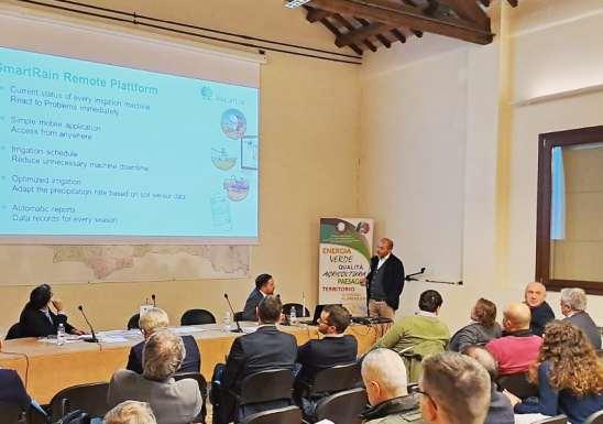 Luca Marzocchi (delante a la derecha) y Patrick Hammer (a su izquierda) presentan VRI y SmartRain como herramientas para el riego sostenible en la agricultura.