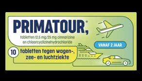 Primatour is al 35 jaar expert op het gebied van reisziekte. Het is een uniek geneesmiddel, geschikt voor kinderen vanaf 2 jaar. De reistabletjes voorkomen en behandelen wagen-, zee- en luchtziekte en als enige geschikt voor korte-en lange reizen. De tabletten bevatten een combinatie van twee werkzame stoffen, cinnarizine én chloorcyclizinehydrochloride. Primatour werkt snel: binnen 20-30 minuten en de werking houdt 4-6 uur aan. Primatour is verkrijgbaar in een verpakking van 10 tabletten.