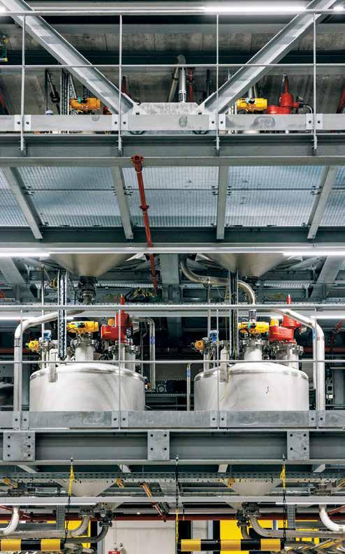 In de LiCoDos afdeling worden alle vloeibare componenten in een volledig geautomatiseerd systeem van leidingen, debietmeters en kleppen in de gewenste verhouding samengebracht in de kuipen die later in de menger gaan.
