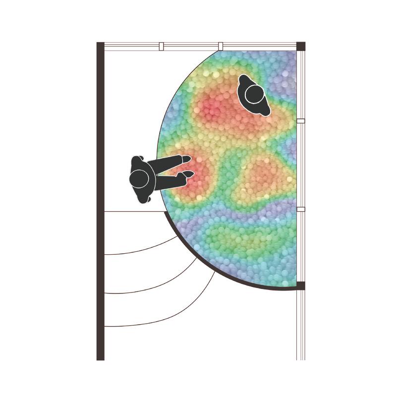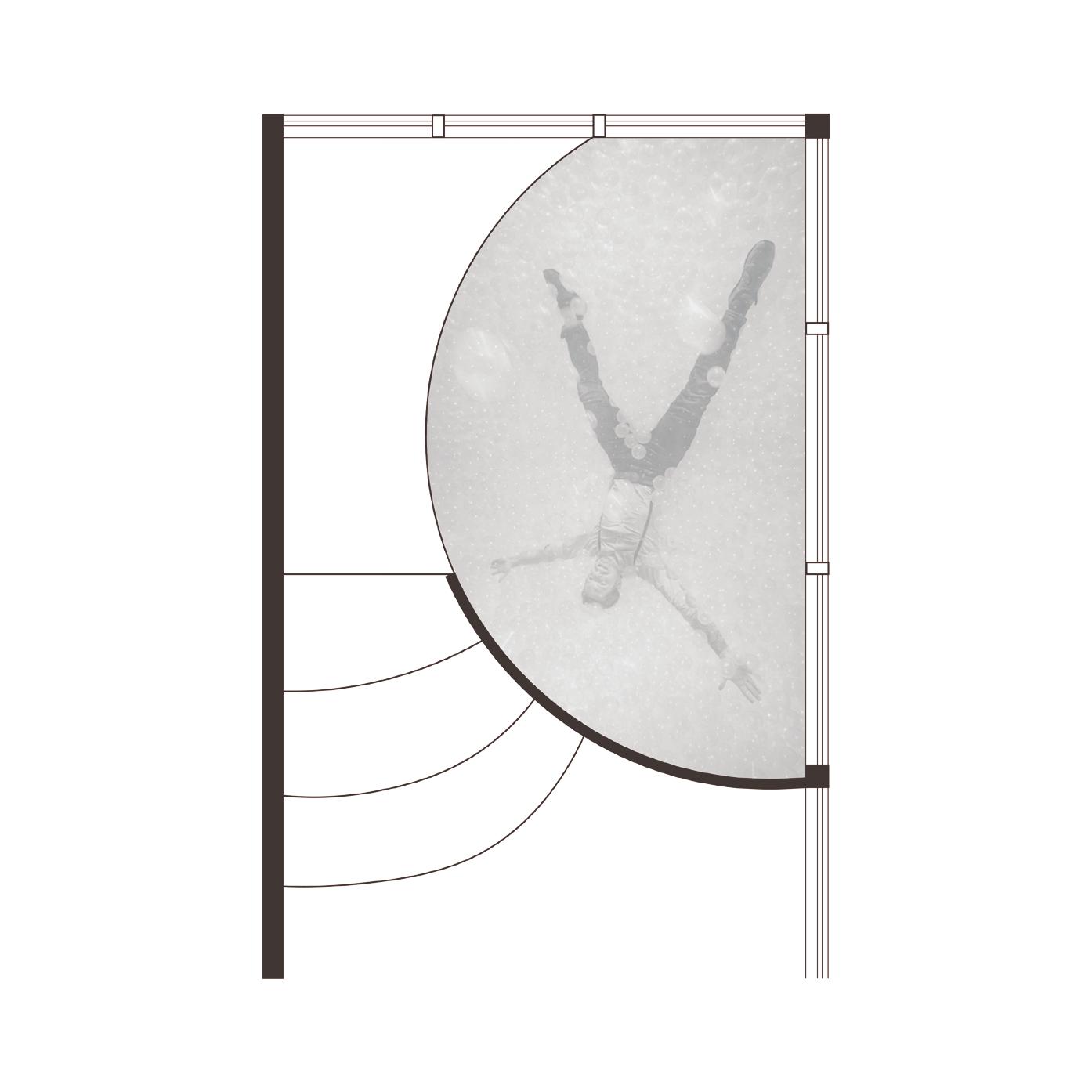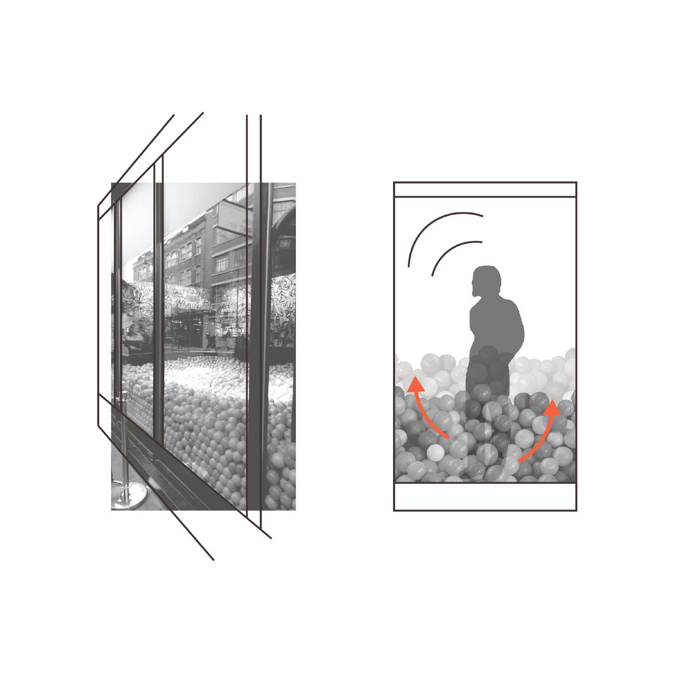 Project Sampling: At Ballie Ballerson, there is one small feature ball bit which is visible from street view and one large ball pit open for all to enjoy The relationship between these two key features A angled channel of space is created as a result. Looking further into the geometry of the small ball the pit and faces them toward others to facilitate conversation. What s interesting about the form and shape and form in the ball pits themselves is that its constantly changing. While each individual ball retains its own shape, waves of them can build up in certain places, responding to the movement of the users. This can be observed in the ball displacement diagram below The concave shapes within the space and the freedom to change the space around you both had a positive impact on how users enjoyed the space. Floor Plan Geometry small ball pit)