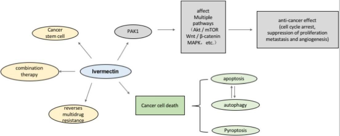 Ivermectin has powerful antitumor effects, including the inhibition of proliferation, metastasis, and angiogenic activity, in a variety of cancer cells. This may be related to the regulation of multiple signaling pathways by ivermectin through PAK1 kinase. On the other hand, ivermectin promotes programmed cancer cell death, including apoptosis, autophagy and pyroptosis. Ivermectin induces apoptosis and autophagy is mutually regulated. Interestingly, ivermectin can also inhibit tumor stem cells and reverse multidrug resistance and exerts the optimal effect when used in combination with other chemotherapy drugs.