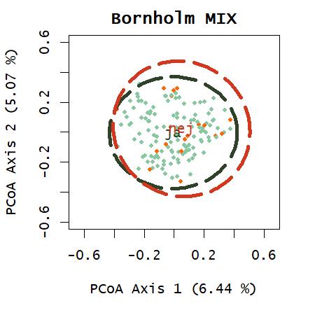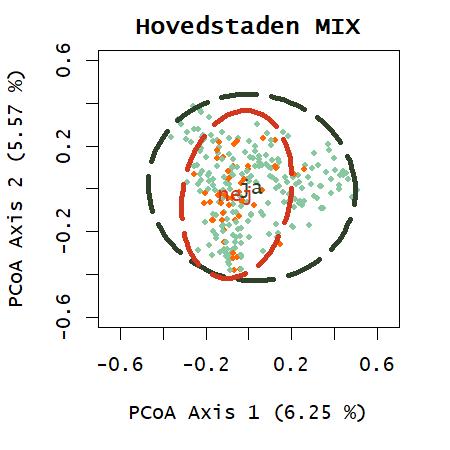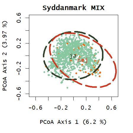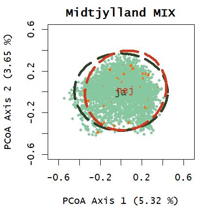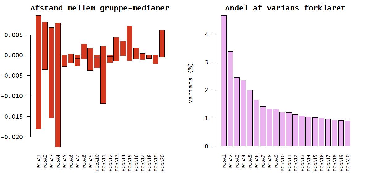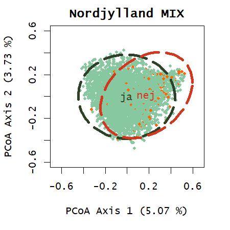 Ordination med artsdata fra de systematiske besigtigelser viser en forskydning af de ikkebeskyttede, som hovedsageligt findes i den venstre del af ordinationsplottet, se figur 10. Der meget få ikke-beskyttede arealer der ikke findes indenfor ellipsen med 95% af de beskyttede arealer, hvilket afspejler at mange arter findes både på beskyttede og ikke-beskyttede arealer. Permanova testen viser signifikant forskel men det kan skyldes manglende varianshomogenitet. Ser man på de første 20 PCoA- akser som er vist i figur 12, er der forskel på gruppemedianerne i flere af akserne, hvilket underbygger, at noget af variansen fra artsdataen kan vise en forskel mellem grupperne beskyttet og ikke-beskyttet. En farvelægning af punkterne, som hver repræsenterer et dokumentationsfelt, med artsindeks-værdier, peger på at PCoA-akse 1, også kan repræsentere artsindekset. Artsindekset sammenholder arternes individuelle følsomhed overfor negative forstyrrelser korrigeret for naturtypens middelscore (Ejrnæs & Fredshavn, 2007). At PCoA akse 1, som afspejler den største repræsentation af variation i datasættet, følger artsindekset, peger på at artsindekset er en god proxy for variationen i plantesamfund på overdrev. PCoA-akserne afspejler dog kun en lille del af variationen i datasættet, måske fordi der er så meget data, fra et stort område og udarbejdet af så mange forskellige markarbejdere. Variationen i PCoA på regionsniveau er væsentligt højere.