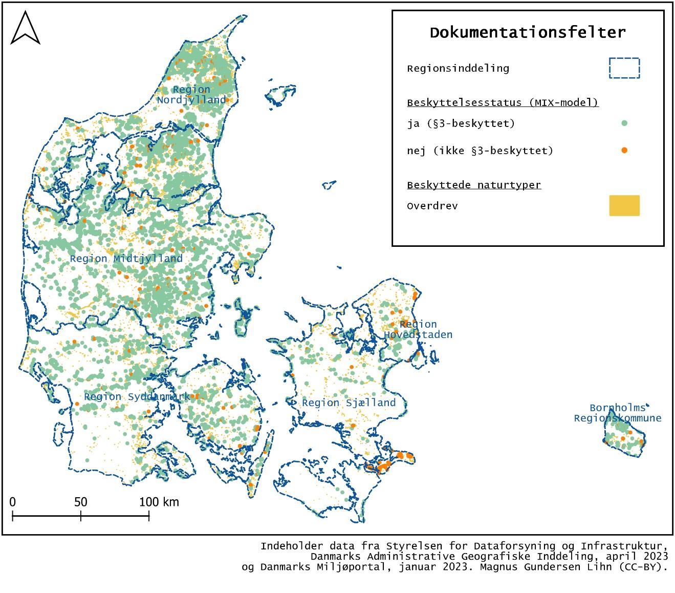 I Danmarks Miljøportal er §3-beskyttede arealer markeret på Danmarkskortet som polygoner, figur 1. Hvert polygon angiver det område som er vejledende registreret som §3-natur. Dokumentationsfelterne kan også findes i Danmarks Miljøportal, men indgår som punkter. Hvert punkt udgør ét dokumentationsfelt. Geografisk data er hentet via ESRI og Geoinfo A/S offentlige tjeneste.