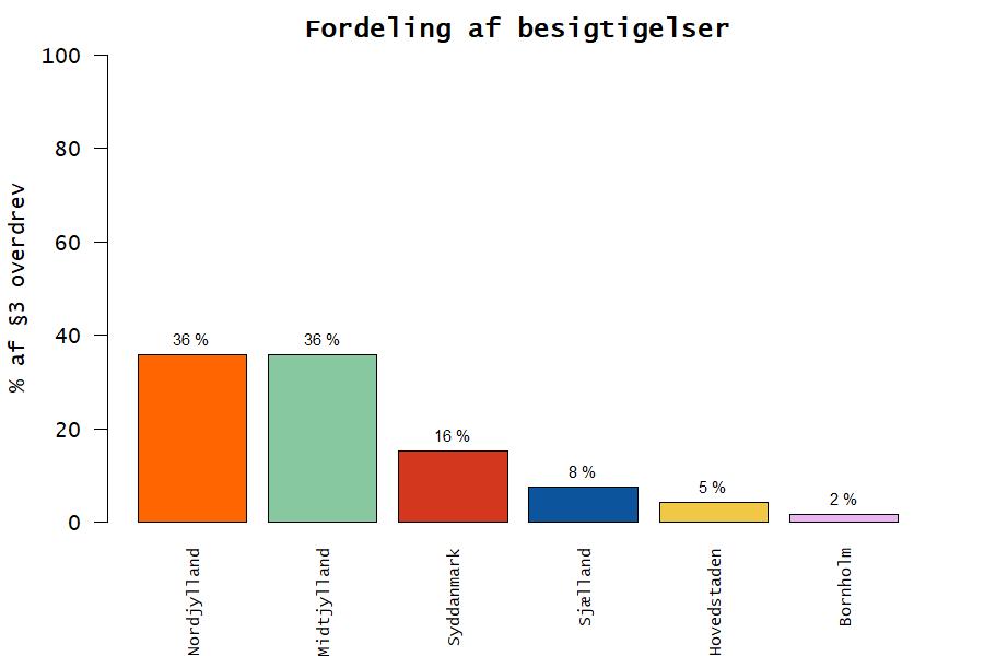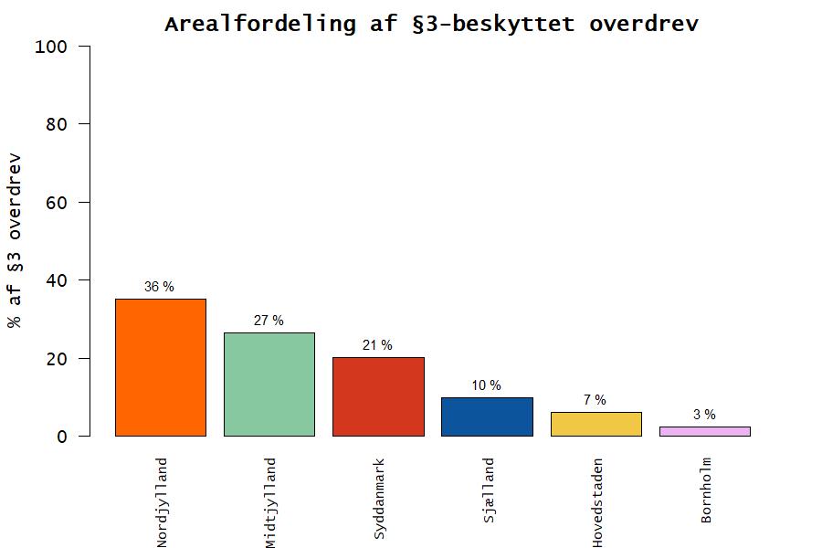 De vejledende registreringer giver et billede af hvor meget af Danmarks areal der er beskyttet gennem Nbl. §3, se figur 1. Fordeling af overdrev på regionsniveau er vist i figur 2. Registreringerne kan også have effekt på tilladelser gennem Husdyrbrugloven (2019) §7, som beskytter overdrev og andre ammoniakfølsomme naturtyper. Husdyrbruglovens bestemmelser betyder, at overdrev kan stå i vejen for driftsudvidelser p.ga. øget kvælstofdeposition, de beskyttede overdrev fremgår af Husdyrgodkendelsesbekendtgørelsens () §2. Desuden udgør registreringerne grundlaget for sagsbehandling, f.eks. ved håndhævelse af ulovlig ændring af §3-beskyttede naturtyper, det kan være pløjning/omlægning af overdrev. Vejledende registreringer er et vigtigt redskab i administrationen (Miljøstyrelsen, 2019) men udgør også et overvågningsprogram, hvor der løbende indsamles store mængder biologisk data fra hele landet (Asbirk & Skafte, 2011; Skov- og Naturstyrelsen, 1997). Ifølge Skov- og Naturstyrelsen (1993) kan registreringen udelades hvis intet i vegetation eller terrænforhold modsiger, at området har været regelmæssigt omlagt.