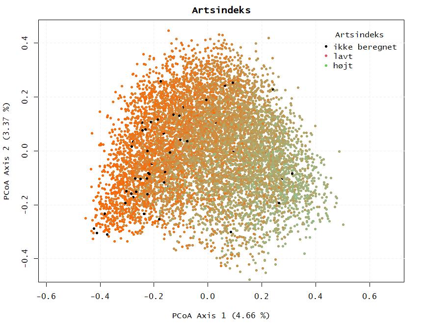 Netop dette afspejles også i PCoA-ordinationen med Artsindeks, figur 11. For nogle dokumentationsfelter er artsindeks ikke beregnet (sorte punkter), de fleste af de sorte punkter ser ud til at ligge i området for ikke beskyttede arealer, det kunne være interessant at undersøge, hvorfor disse arealer ikke har fået beregnet artsindeks.
