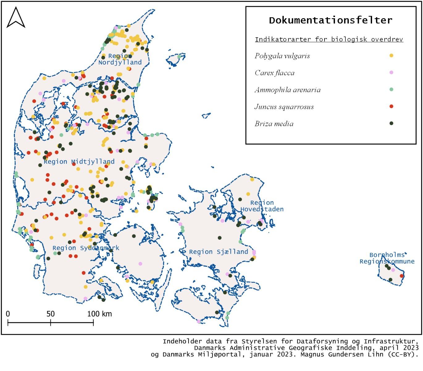 Datasættet indeholder store mængder data om de beskyttede arealer og derfor kan viden om forskelle mellem regioner, måske alligevel findes ved at teste indikatorarter for regioner. Disse indikatorarter ville i så fald kunne indikere forskelle mellem regionernes biologiske overdrev. Analysen kunne også laves på de arter som findes på overdrevsskemaet for at lette feltarbejdet. Kortet, figur 14, viser hvordan indikatorarter kan være lokalt forekommende og derfor ikke er lige gavnlige i sagsarbejdet i hele landet, f.eks. er alm. mælkeurt (Polygala vulgaris) ikke fundet på beskyttet overdrev på Bornholm og børstesiv (Juncus squarrosus) hovedsageligt fundet i Jylland.