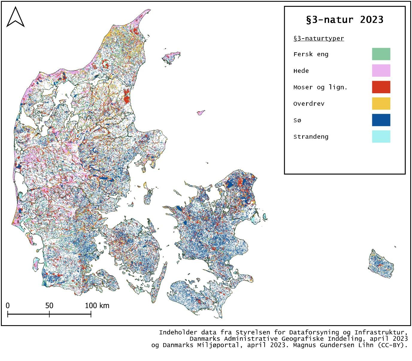 Figur 1 Kort over udbredelsen af udvalgte §3-naturtyper i Danmark. Kortet afspejler de vejledende registreringer af arealerne. Datagrundlaget er Danmarks Miljøportal, april 2023.