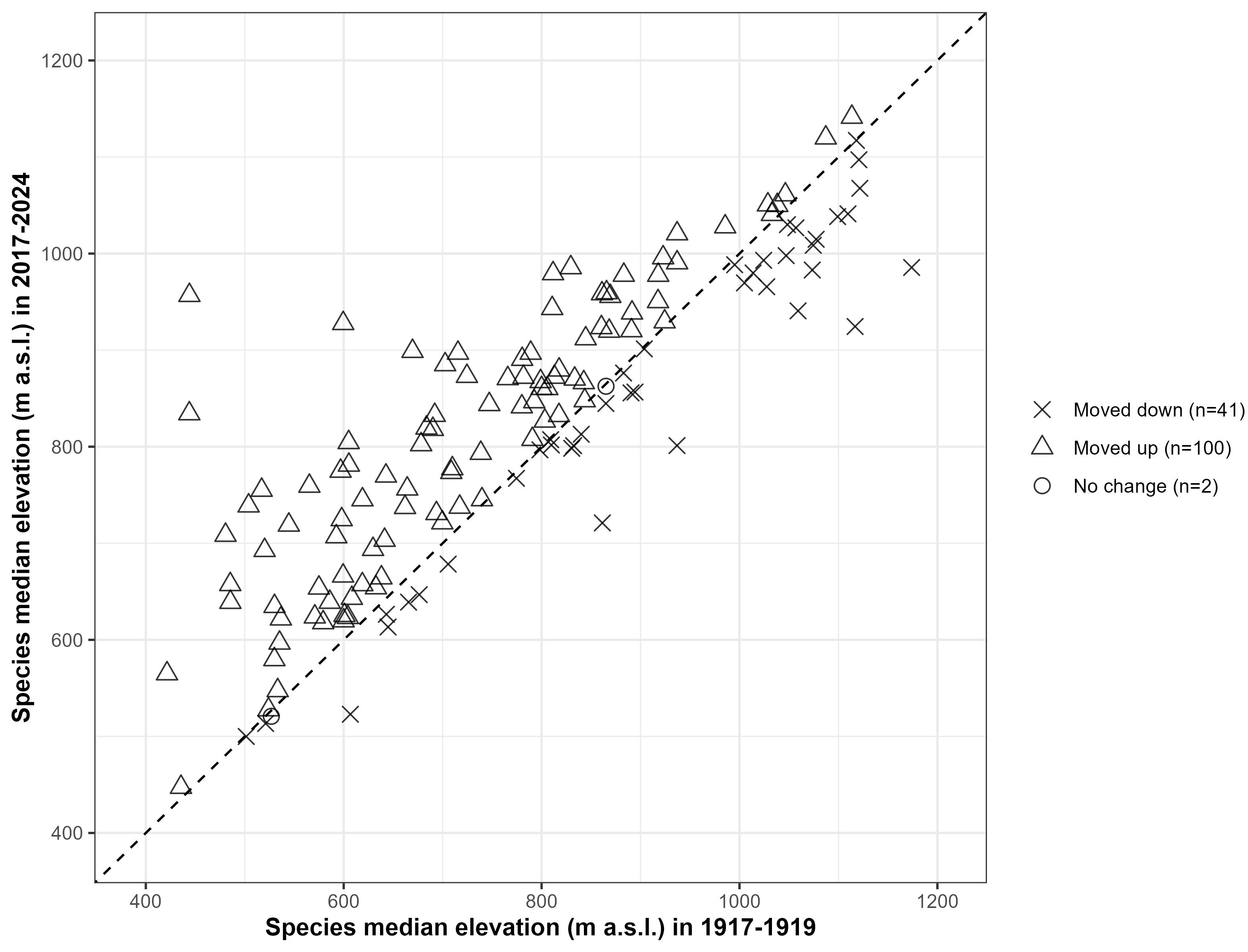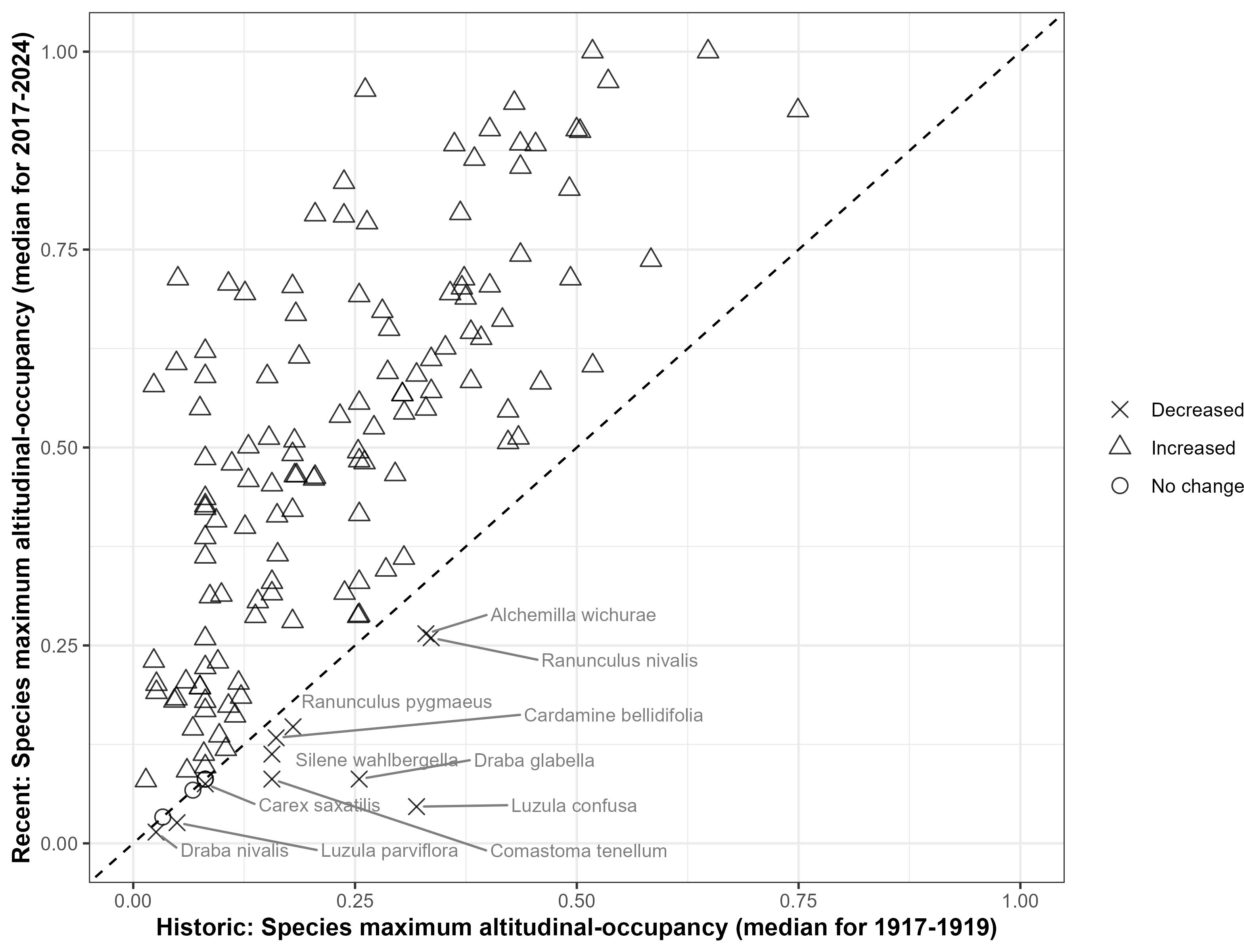 Figure 1 - Range changes at Mt. Nuolja showing the 143 species that were found in both recent and historic surveys. (a) Species mean elevation in years 1917-1919 compared with mean elevation in recent years 2017-2024, the median is used to aggregate elevation means from years to time (recent/historic). Triangular shaped points are species that have moved up in mean elevation and crosses indicate species that have moved down. Specie with no change in mean elevation are indicated with round points. (b) Species ranges are not only moving up or down but also contracting or expanding. Historic ranges calculated as the percentage of range covered by the plots in wich the species occur is compared with the same calculated elevation occupancy for recent years. Species names are shown for the 11 species with contracting occupancy (points with cross shape). Species with increasing altitudinal-occupancy have triangular points (n=129) and species with no change in elevational-occupancy has circular points (n=3)