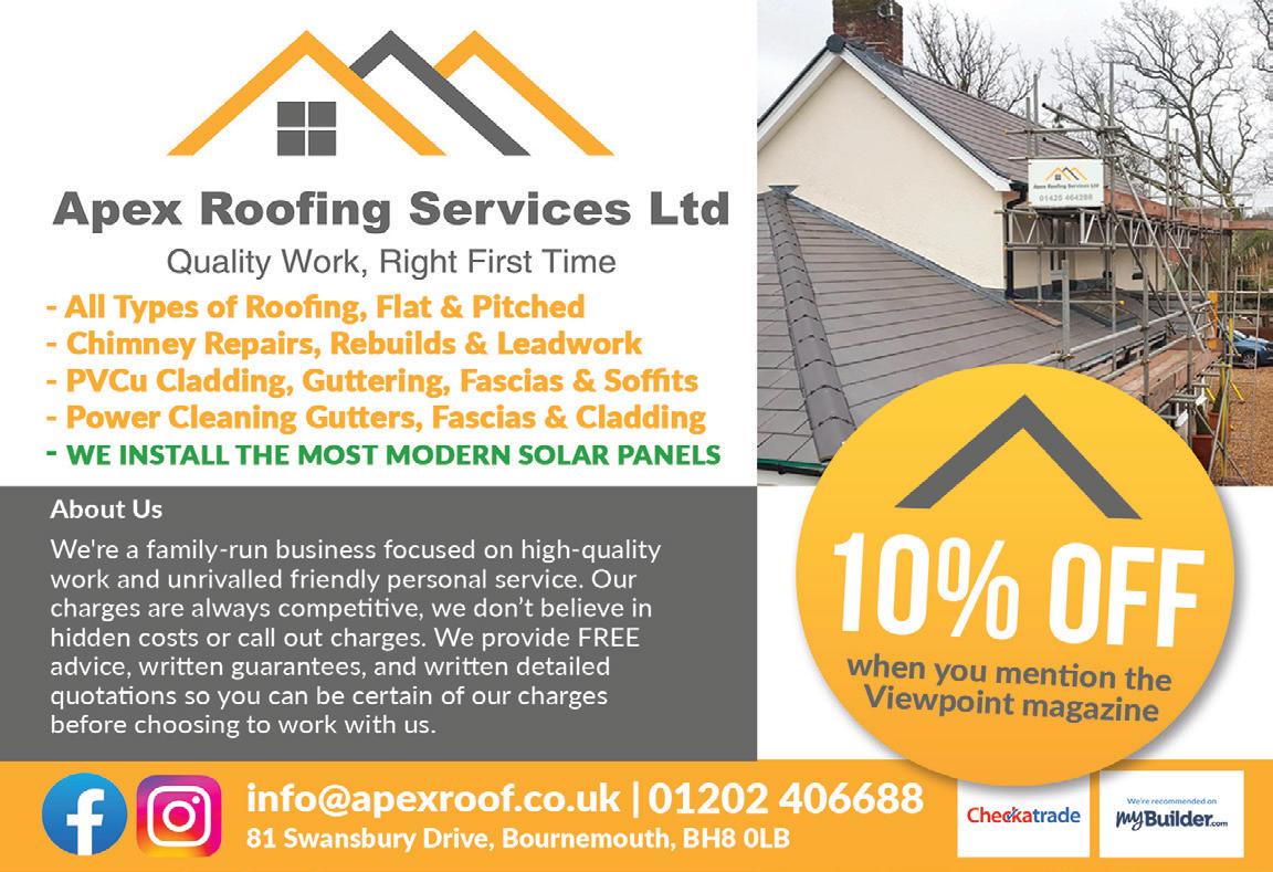 VIEWPOINT is independently published and distributed free to homes and businesses in selected areas of Dorset and Hampshire. Views or opinions expressed in VIEWPOINT are not necessarily those of the publisher. The publisher reserves the right to refuse any advertisement deemed to be unsuitable for publication. Information about a service does not imply recommendation. All purchases made through this publication are done so entirely at your own risk. The copyright on all written material, logos and advertising artwork produced by our studio remains with VIEWPOINT and should not be reproduced without prior written permission from the publisher. The company’s privacy policy can be read at www.dorsetview.co.uk
