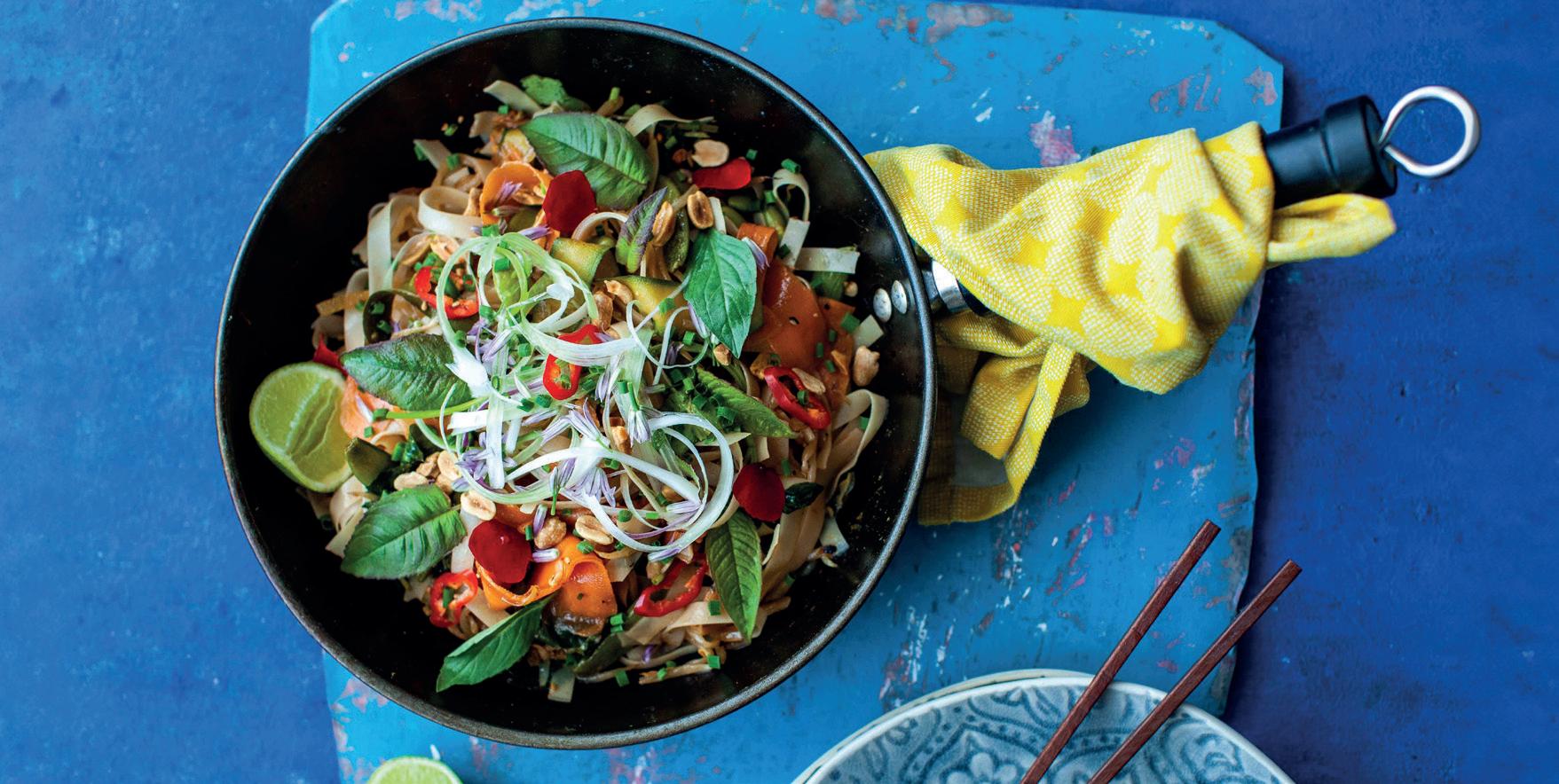 5. Mix in the edamame and move the vegetables to the side of the wok. Pour in the tamarind mixture and cook for 30 seconds before mixing through the cooked noodles.