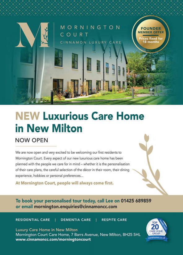 Keepdoing what youlove at Homefield Grange Wewillnevercompromisewhatmatterstoyouandyourfamily HomefieldGrangeCareHomegivesyoumuchmorethan alovelynew home.Whether you enjoyafternoon teawith family, tending to the gardenordancing to your favouritemusic, there’ssomething foreveryone.Plus you’llhave the added reassuranceofhelp when you needitbecause we always putresidents’ wellbeing,independence, personalpreferencesand safety at theheart of everything we do. Ourcarehome isopen for viewings Callusonfreephone0808 2235401 caringhomes.org/homefield-grange Salisbury Road,Winkton,Christchurch, DorsetBH237AR