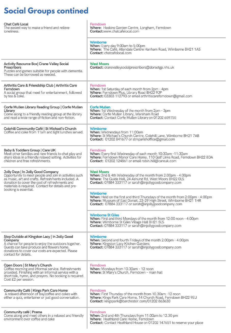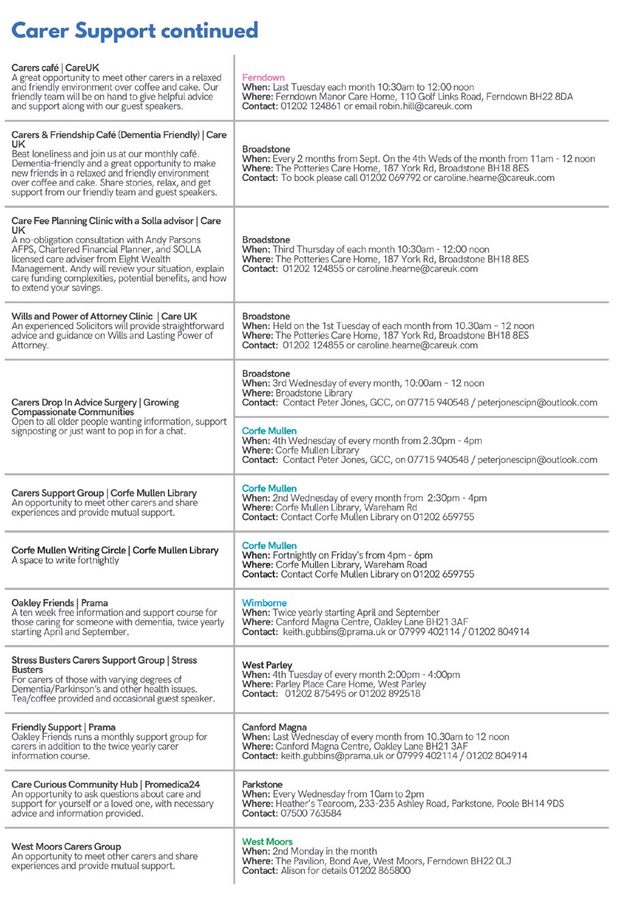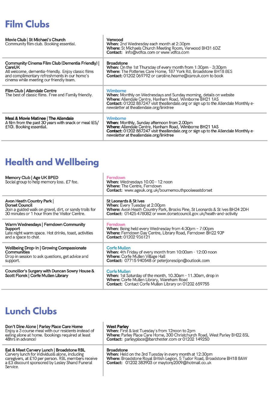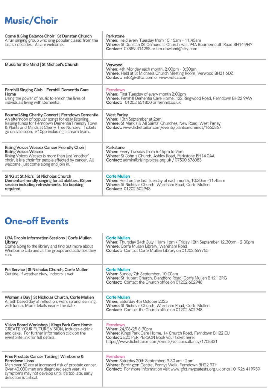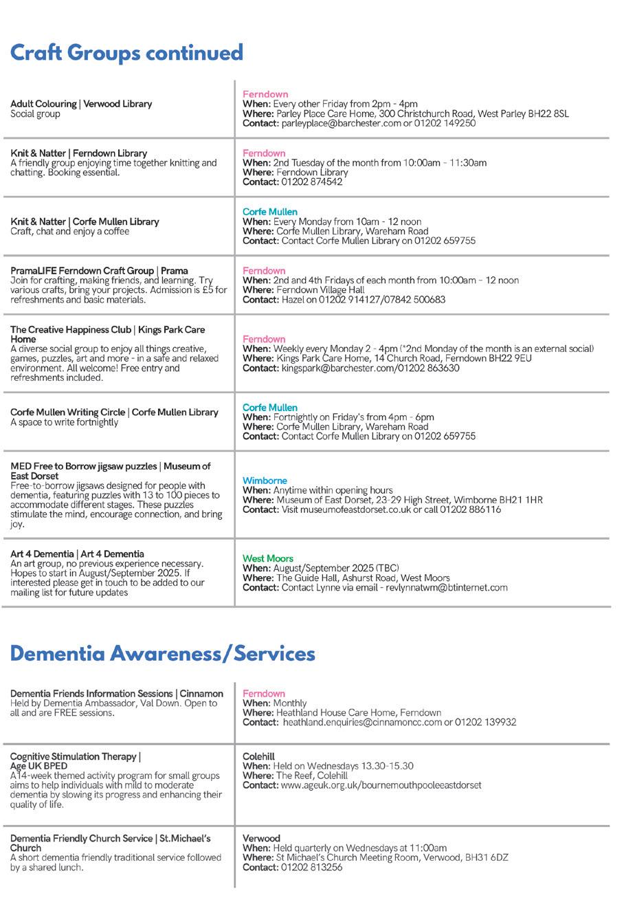 West Moors Dementia Action Group 01425 477470 Lynne Morris/lynnemorrislp@btinternet.com