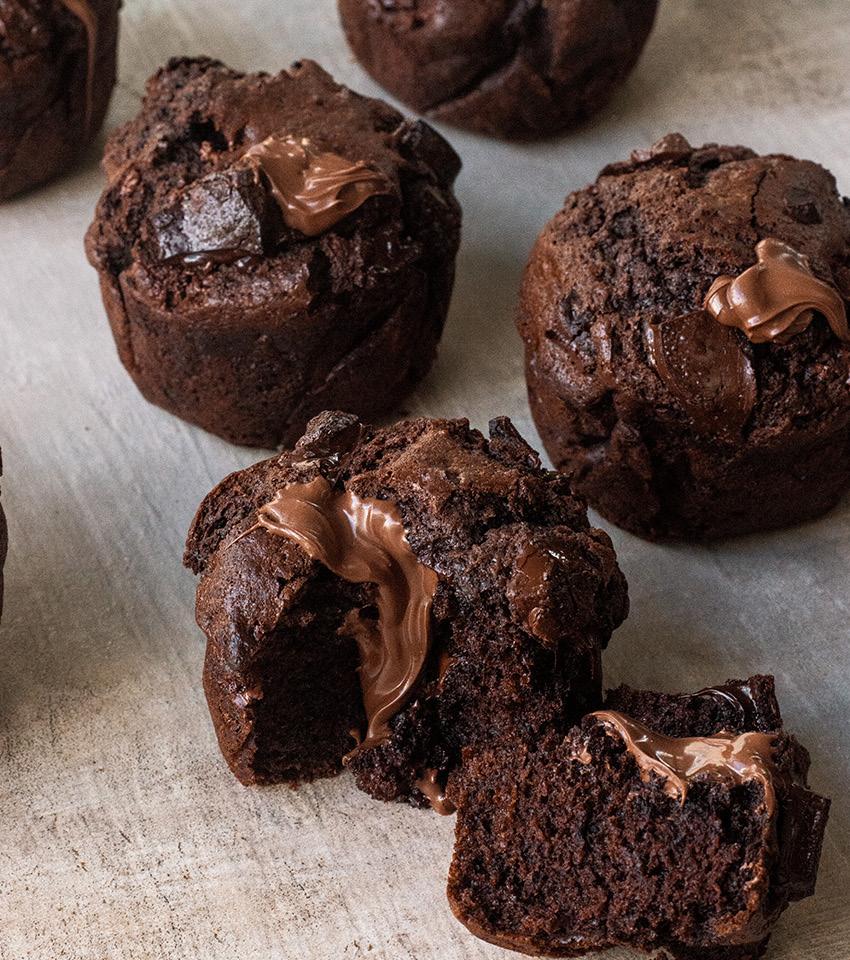 Spoon into the tins, filling them to the top. Scatter over the remaining chocolate. Bake for 5 minutes at 210°C then turn the temperature down to 180°C regular bake and cook for about 18-20 minutes or until the muffins are cooked. Cool until just warm.