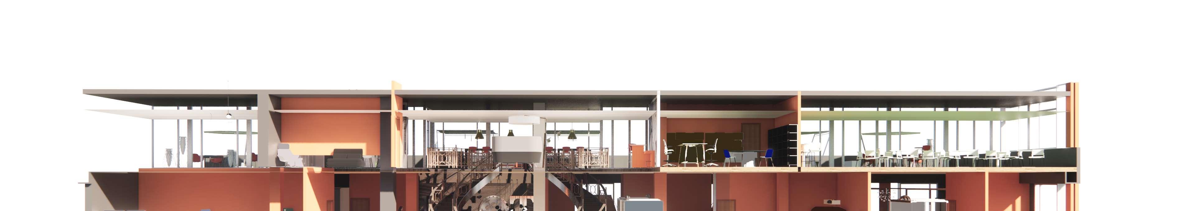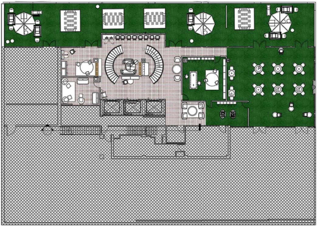 The central, mirrored monumental staircases provide symmetry and balance. The stairs encompass two crucial zones: the reception on the 7th floor and the work cafe on the 8th floor. I created a focal point with my mirrored logo behind the reception desk. Custom tile with the "X" design is featured on the reception desk and upstairs in the work cafe.