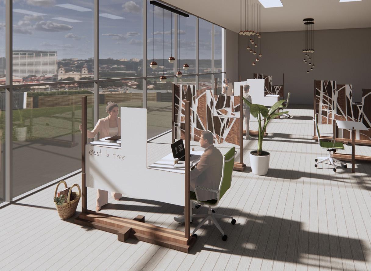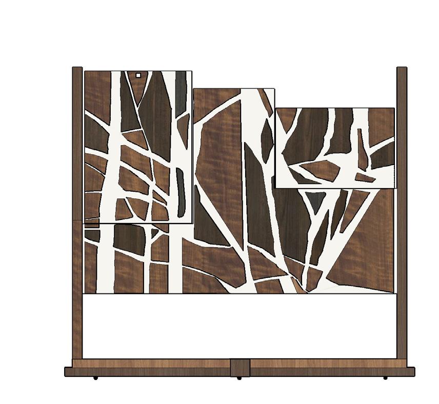 Inspired by the kaleidoscope of light that is created by overlapping tree branches, C’est la Tree is a multifunctional piece built for the modern person. Whether working from home or at the office, this design provides Biophilic beauty and workspace flexibility. Wheels provide control over the environment. Two panels fold down 90 degrees to provide a sitting and standing desk. This flexible screen as one unit or combined with others, provides a casual, collaborative ambiance.
