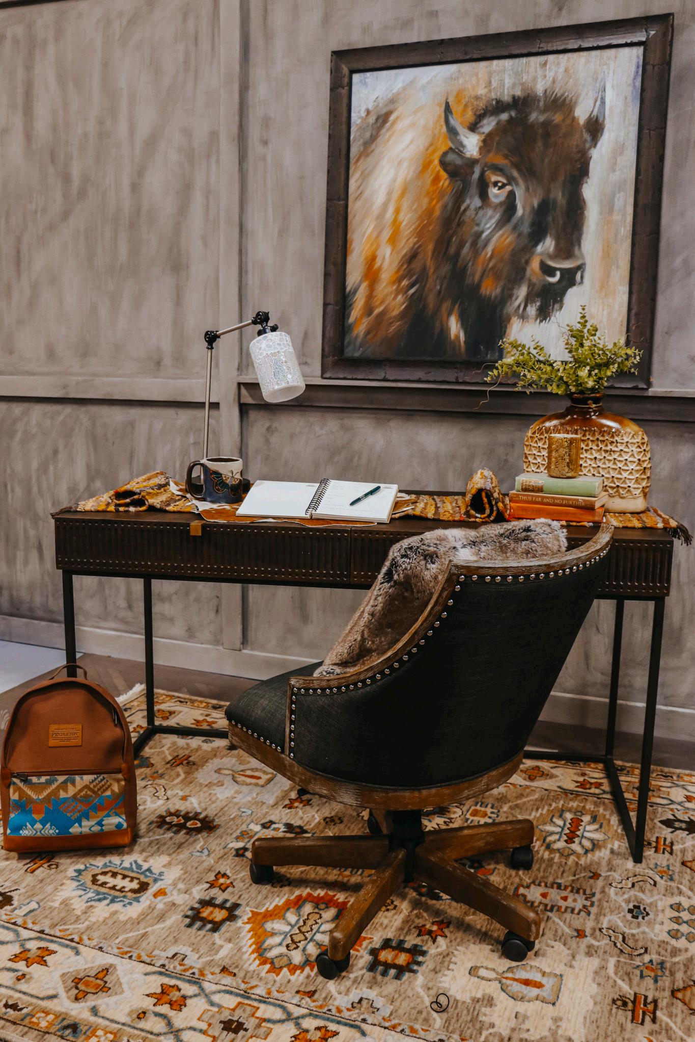 The Buffalo painting and fur pillow provide a relaxed sense of comfort. The brown and beige pallet evoke tranquilty
