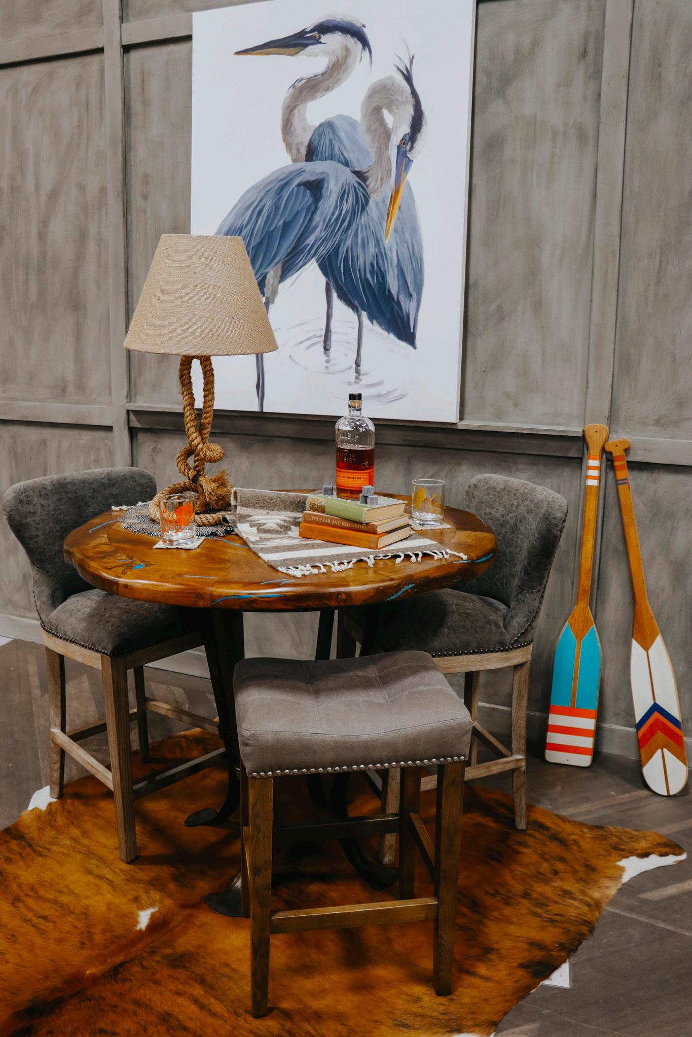 The fur rug provides a textured and visual piece of interest. The graceful blue heron art speaks to the waterfront landscape. Colorfully painted paddles provide whimsical relief.