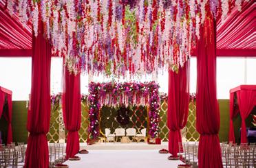 The ceremony served as the emotional and visual anchor of the day. An open-air mandap framed with lush florals and layered textures created a setting that felt both romantic and architectural. Soft blush tones, deep reds, and natural greenery worked together to form a backdrop that elevated the rituals without overshadowing them. As Shivani made her entrance, the aisle—lined with florals and gentle movement—set a deliberate pace, drawing guests into a moment that felt sacred and unhurried.
