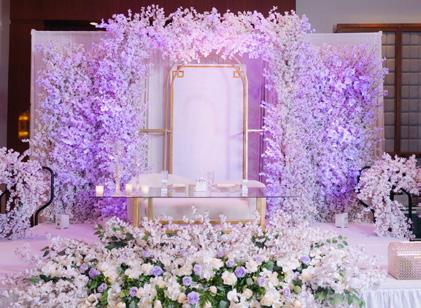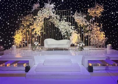 As evening arrived, the reception marked a graceful transition in tone. The space was transformed into an elegant environment where florals, lighting, and scale worked in balance. A striking stage design became the focal point, dramatic yet refined, setting the scene for speeches, first dances, and an energetic night of celebration. When the music began, the atmosphere lifted naturally, filling the room with movement and excitement that carried late into the night.