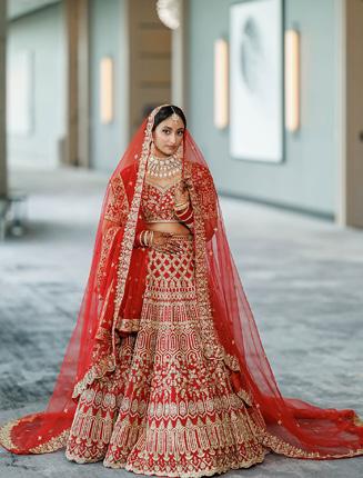 As the wedding day unfolded, Garima’s bridal portraits captured a striking sense of grace and confidence. Her red lehenga—rich, timeless, and undeniably regal—moved beautifully against the lush outdoor setting. Intricate mehndi, delicate jewelry, and soft, glowing beauty details completed a look that felt rooted in tradition yet effortlessly modern. Every frame reflected a bride fully present in her moment, poised and radiant.