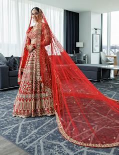 From the very first moments, the imagery tells a story of contrast and harmony. Shayal’s striking red bridal ensemble—rich in tradition and drama—made unforgettable statements whether framed against sleek architectural lines or illuminated by soft indoor light. Her veil trailed behind her like poetry in motion, creating cinematic moments that felt powerful yet intimate. Close-up details of mehndiadorned hands, layered jewelry, and quiet bridal portraits revealed a bride fully present in her moment—grounded, radiant, and confident.