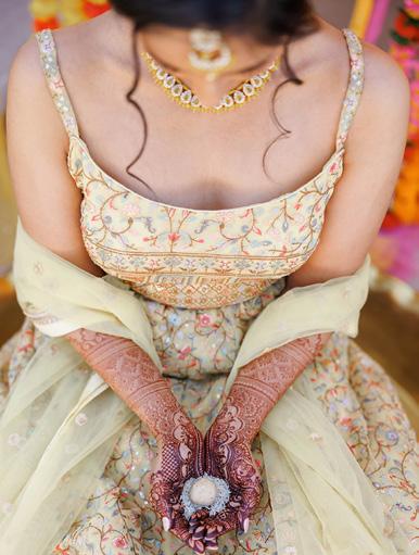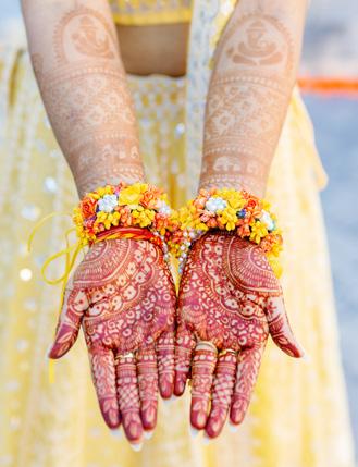 The festivities began with joyful pre-wedding moments that set the tone for the days ahead. Bright yellows and marigoldinspired hues filled the space during the haldi, with laughter spilling freely as family and friends surrounded the couple in celebration. These moments felt carefree and sun-drenched, the kind that remind you weddings are as much about shared joy as they are about ceremony.