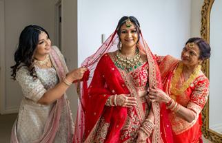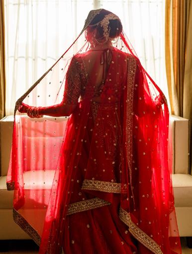 Shivani’s bridal look was timeless in the truest sense. Her red lehenga honored classic Indian bridal tradition, while refined styling and heirloom-inspired jewelry gave the look depth and presence. Close-up moments captured the beauty in the details: mehndi patterns delicately etched onto her hands, the quiet ritual of final adornments, and fleeting expressions shared with loved ones. These intimate frames added texture to the day, revealing emotion beneath the grandeur.