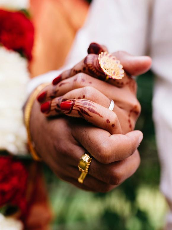 And because details were everything, décor became a full experience. Their sangeet transformed the venue entrance into an open-air Indian market with colorful carts for chai, bangles, and bindis, plus a live dosa station and henna artists. Even the signage nodded to heritage, written in both English and Kannada. Florals carried meaning beyond beauty: a rose-filled mandap in red, peach, pink, and white; gold vases tipped on their sides with blooms spilling out like a painting; jasmine tucked into bridesmaids’ hair; and bright malas exchanged during the ceremony. Afterward, guests gathered for a South Indian thali luncheon served at long communal tables with brass thali sets, elephant-printed napkins, menus for each dish, marigold petals, and jasmine garlands overhead—traditional, thoughtful, and absolutely photogenic.