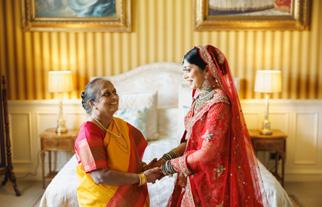 London offered a striking contrast. At North Mymms Park, the celebration leaned into old-world grandeur, where historic architecture and sweeping grounds framed a ceremony steeped in tradition. The mandap design echoed softness and symmetry, blending naturally into the estate’s surroundings. Here, Anjali & Sunny’s story took on a cinematic quality—long walks across manicured lawns, intimate moments beneath archways, and group portraits that felt regal yet relaxed.