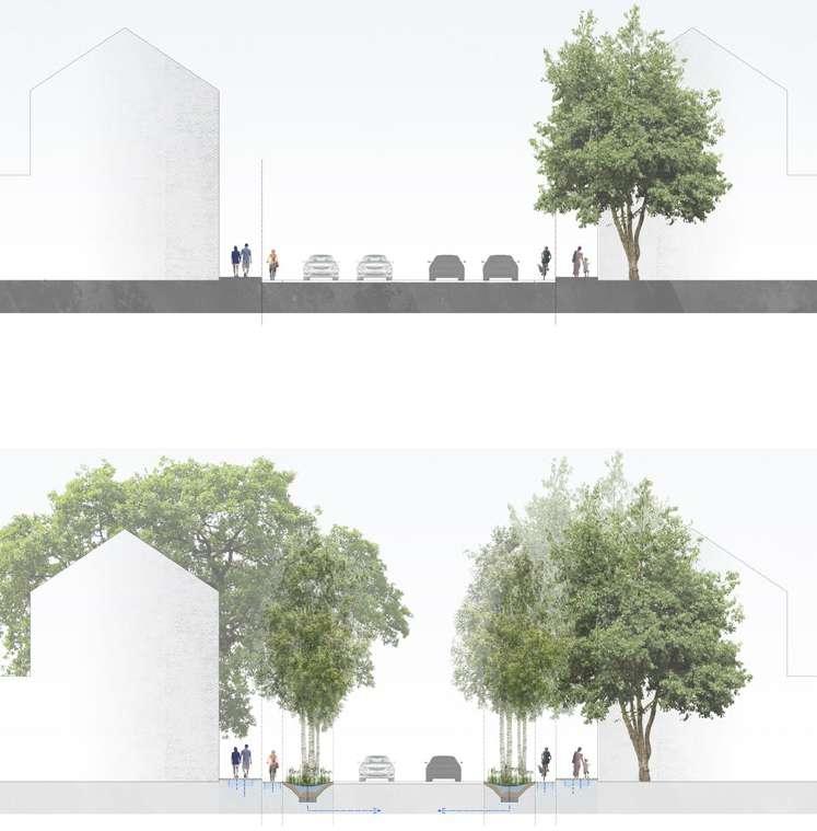 The Green-Blue strategies proposed in multiple public and private areas tackle climate change effects, but also transform it into more diverse spaces accomodating nature, water and communal activities to strenghten diversity on different levels. Main roads are recon figured reducing cars and giving more space for nature and soft mobility. At the same time, neighborhood streets are greened and transformed into shared spaces for the community. Water infiltration is enhanced also by using permeable materials for hardscapes.