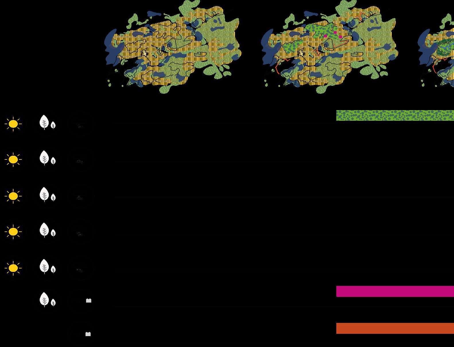 385 Green area Urban ribbon Monocultural fields Scattered settlements Canalized Moervaart Collective donks development Agroforestry pockets Archipelago ecosystem Renaturalized Moervaart floodplain treatment Phyto-remediation canals Resevoir & infiltration ponds Blackwater recycling ponds Reusable water reservoir Seperate sewage system Agriculture Green area Sealed surface Water body Partially desealed Black water Black water Humanure Grey Water Grey Water Rainwater Koppelingsgebied The donks platform Agricultural lowlands Selfsufficient archipelagos Moervaart valley Runoff Desealed Street Stormwater runoff from monoculture fields Poory services ribbon developments Agricultural desert under heat and drought stress Loss of Moervaart valley ecosystem & increased flood risk